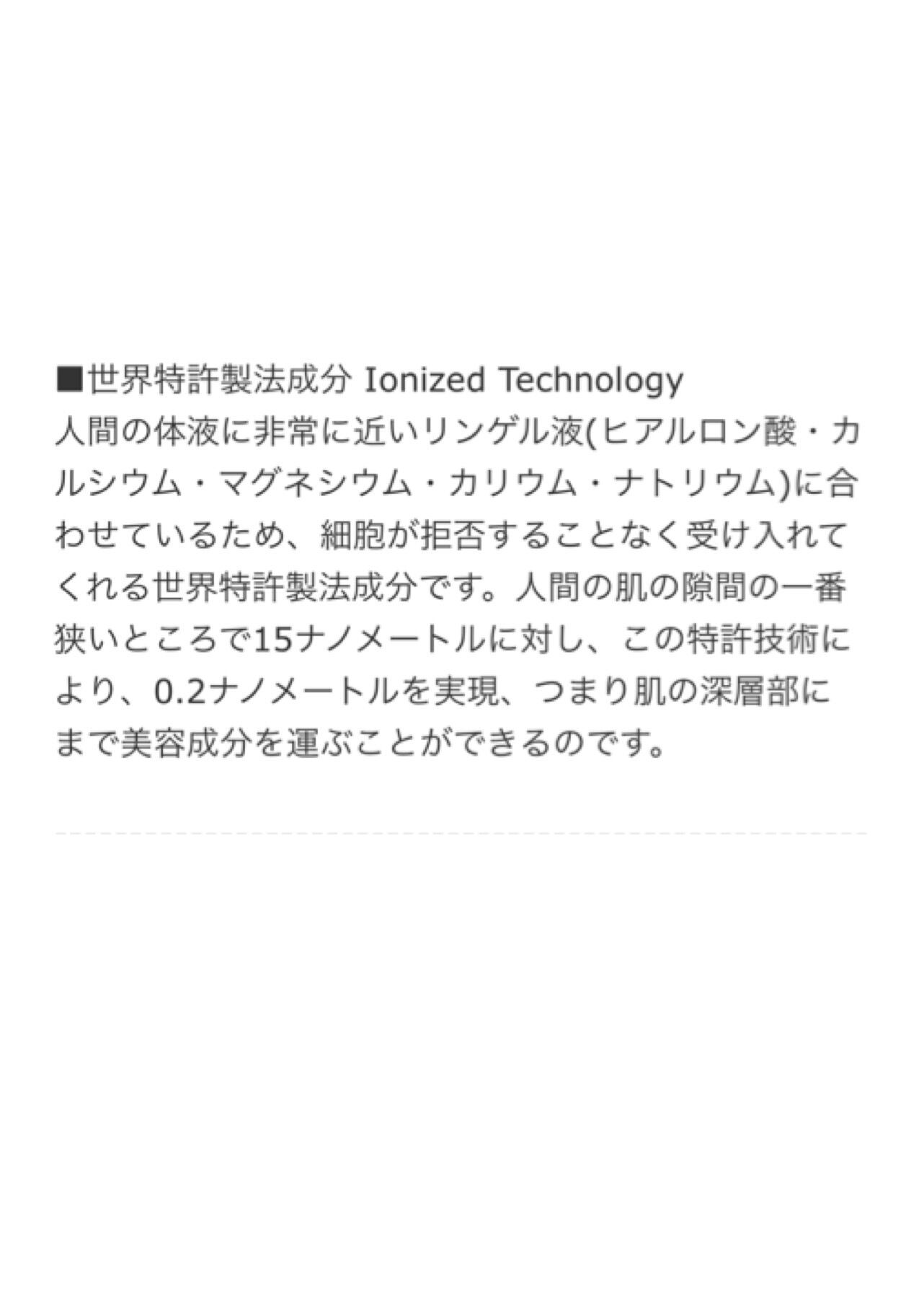 世界特許製法成分である【イオン化ミネラル】の働きで年老いた鶏肉の切り身を若返らせるという技術から生まれた化粧品となります。
